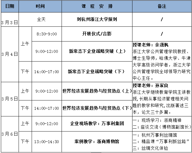 为提升我校“国际注册职业经理人暨企业管理硕士学位高级研修班”学员学习,提高研修班学员的能力与素质,我校拟于3月3日赴浙江大学开展培训活动,现将具体事宜通知如下: